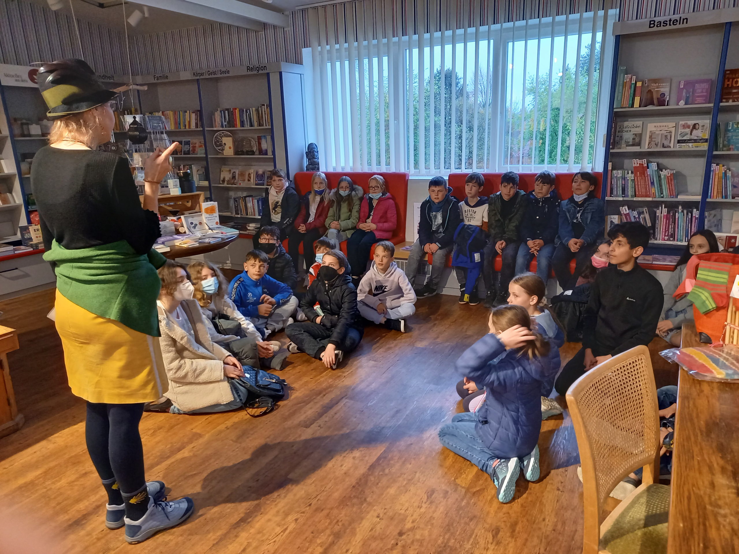 Bevor die Schüler schließlich ihr Buchgeschenk „Iva, Samo und der geheime Hexensee“ von Bettina Obrecht entgegennehmen durften, informierte Frau Nagel die Klassen über die Aufgaben eines Buchhändlers und die täglich in der Buchhandlung anfallenden Arbeiten.