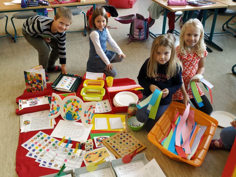 Eigentlich war es nur als Literaturprojekttag geplant, als Frau Heinrich-Köppl, ehemalige Rektorin der Herzog-Albrecht Schule Siegenburg, die Kinder der 1. Klasse mit einem Vorlesebesuch überraschte. Doch die Begeisterung über „Elmar“, den bunten Elefanten aus dem Bilderbuchklassiker von David McKee, sollte nach Bilderbuchkino und szenischer Nachgestaltung nicht gebremst werden und so wurde fast eine Woche lang immer wieder mit oder über Elmar gesprochen, gelesen, geschrieben, gerechnet, gemalt oder gebastelt. Dabei waren die Kinder nicht nur bei den frei wählbaren Beschäftigungsangeboten oder dem Erwerb von Sachwissen rund um Elefanten besonders aktiv, sondern setzten sich auch hoch motiviert und einfühlsam mit den sozialen Botschaften des Buches auseinander. Fast schon philosophisch klang da die Zusammenfassung eines Schülers, der meinte: „Irgendwie sind ja auch wir alle bunt. Innen und außen. Und das ist auch gut so!“ Schöner kann soziales Lernen und Erziehung zu Selbstbewusstsein und Toleranz nicht fruchten!