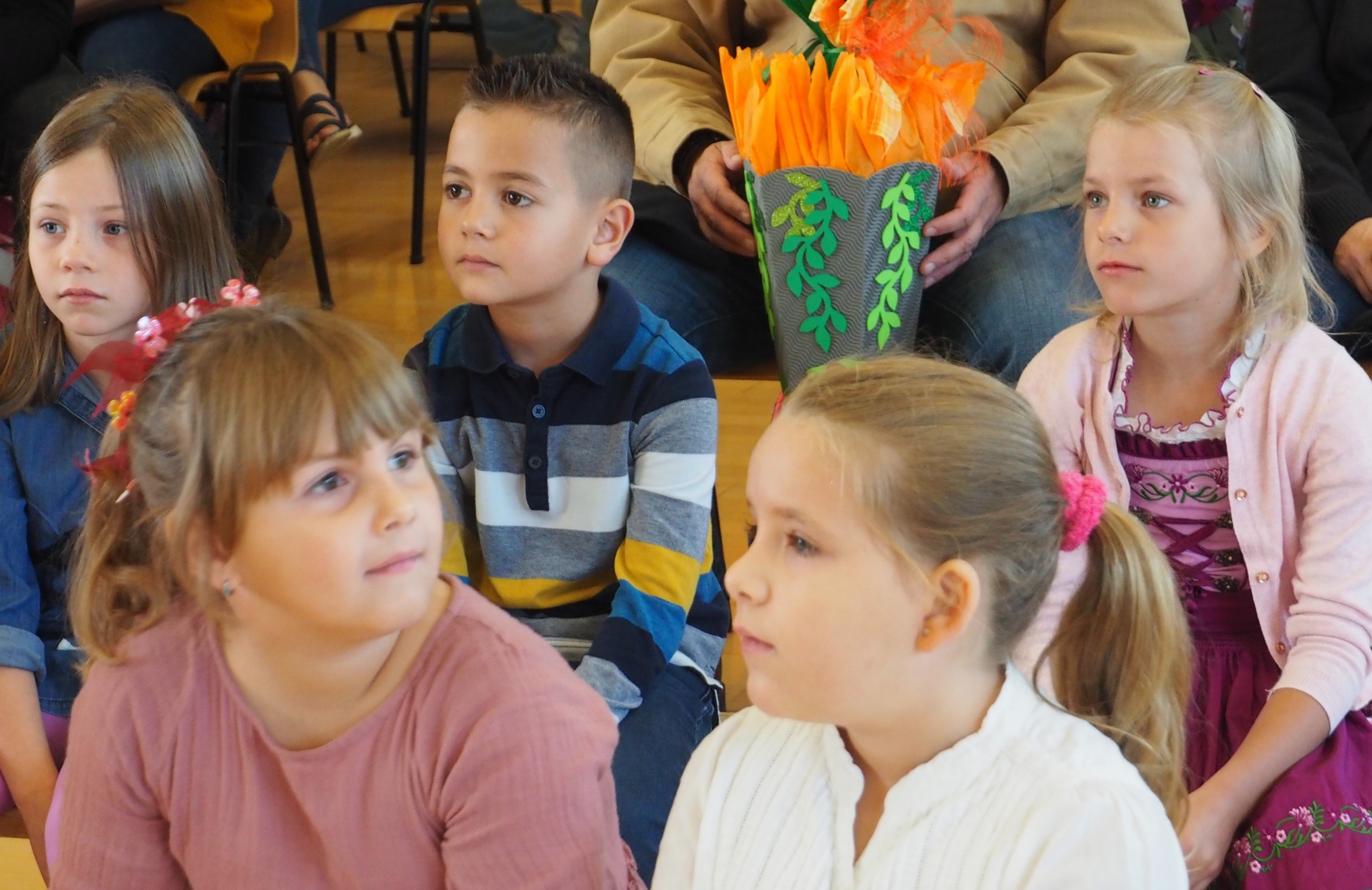Mit tollen Schultüten und ein bisschen aufgeregt begann um 8:30 Uhr zuerst die Einschulung der Klasse 1a. Nach der herzlichen Begrüßung durch den Rektor Herrn Hottner stellte die Klassenlehrerin Manuela Zuleger 4 Tierkinder vor, die ebenfalls ihren 1. Schultag erleben durften. Der aufgeregte Leo Löwe konnte zunehmend seine Aufregung in den Griff bekommen und freute sich mehr und mehr auf die Schule.