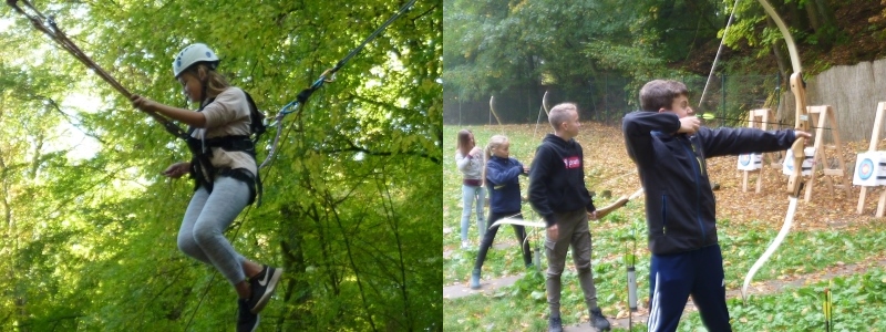Dienstag und Mittwoch standen ganz unter dem Zeichen gemeinsamer Aktivitäten auf dem weitläufigen Gelände rund um das Hauptgebäude. Am ersten Tag absolvierten die Schüler einen Orientierungslauf, bei dem es galt, mit Kompass, Karte und GPS einen Zahlencode zu finden. Als Zwischenaufgabe wurde ein Floß gebaut und auch gleich eine Probefahrt auf dem Hausteich gemacht. Auch im Bogenschießen versuchten sich die Schüler und erzielten beachtliche Ergebnisse.
