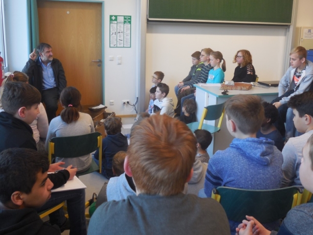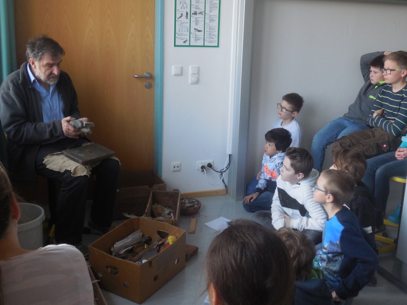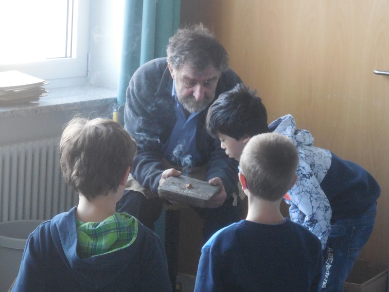 Der Archäologe Lothar Breindl aus Landau an der Isar, der Schulklassen bereits seit 20 Jahren besucht, erzählte zunächst von der Arbeit und den Funden bei seinen archäologischen Ausgrabungen. Außerdem zeigte er den Kindern wie die Steinzeitmenschen mit “Zunderwolle” und Feuersteinen Feuer machten und stellte aus einem Feuerstein kleine, spitze, scharfkantige Messer her.