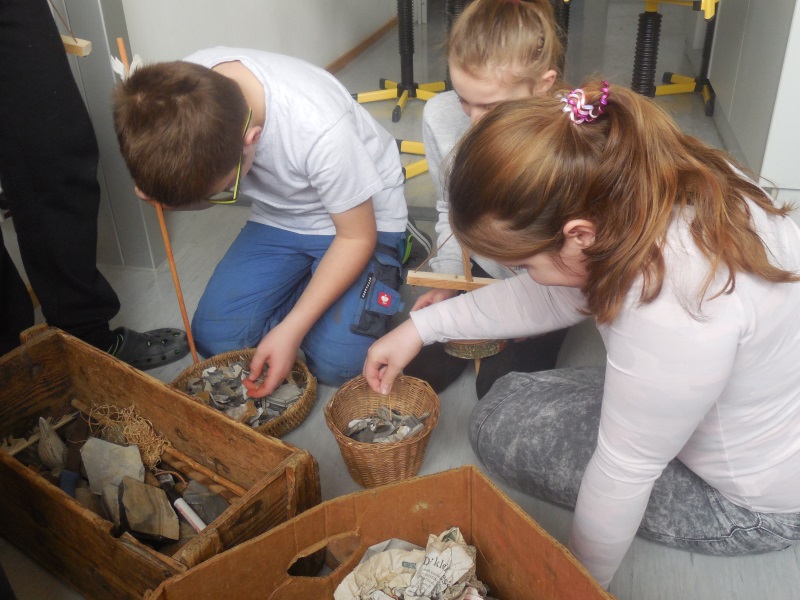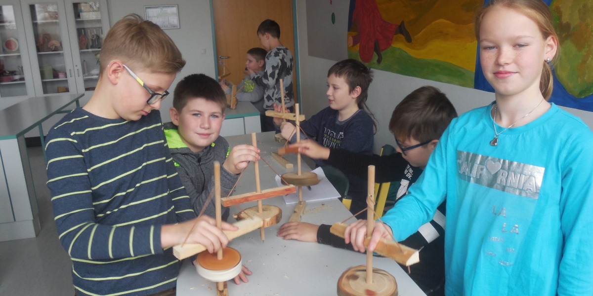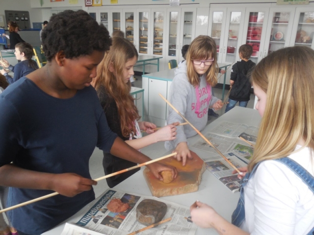 Nach der Pause konnten die Schüler im zweiten Teil nach einer kurzen Einweisung auswählen, welche steinzeitlichen Gegenstände sie basteln wollten. Im Angebot waren Holzbohrer, Pfeile, Schwirrholz (Steinzeittelefon), Muschelketten oder Tonwaren.