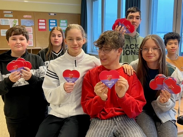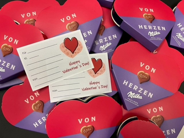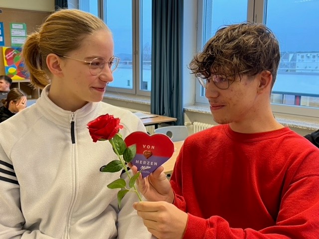 Die Mädchen und Jungen der Klassen 5 – 10 bestellten dazu bei den Schülersprechern im Vorfeld Schokoherz-Schachteln in der Anzahl der Personen, die sie beschenken möchten. Gleichzeitig beschrifteten sie die dazugehörigen Grußkarten mit netten Botschaften. Am letzten Schultag vor den Faschingsferien gingen die Schülersprecher Philipp und Theresa durch die Klassen und verteilten die „süßen“ Herzen zusammen mit den Grußkarten an die Empfänger.